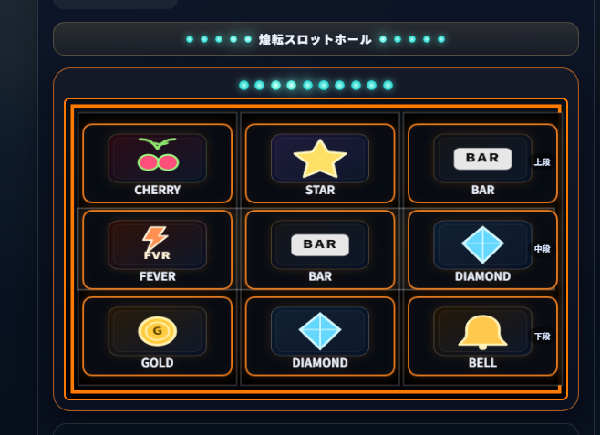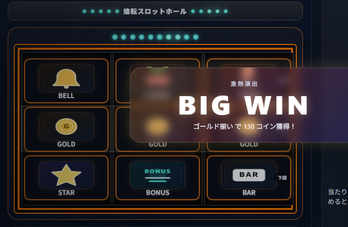 「煌転スロットホール」は、オンライン上のホールに集まり、台を選び、着席し、自分の手でリールを止めて楽しむ本格スロットゲームです。